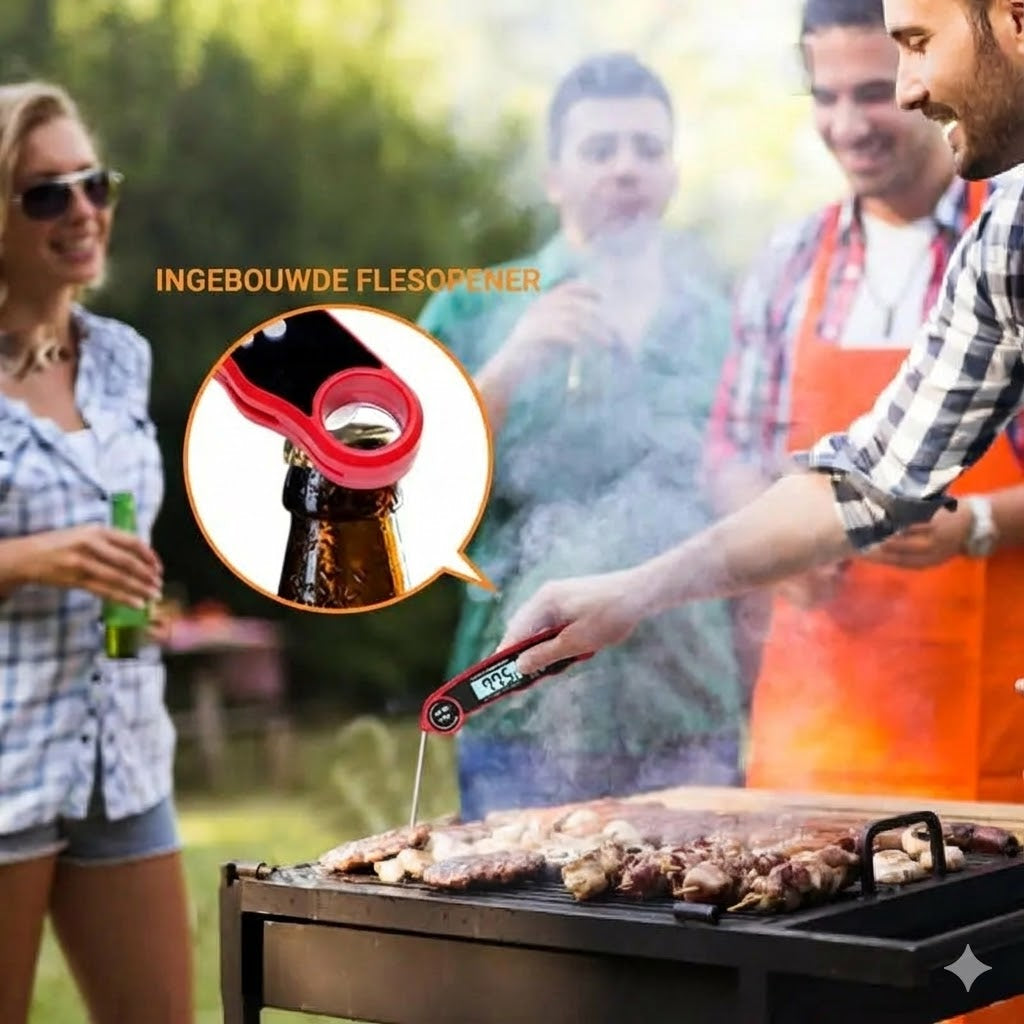 Maak je barbecue-ervaring compleet met een slimme toevoeging die elke grillmeester zal waarderen. Deze thermometer beschikt over een ingebouwde flesopener, zodat je tijdens het draaien van het vlees moeiteloos en direct een koud biertje of frisdrank kunt openen. Het combineert professionele meetprecisie met sociale functionaliteit, wat het gebruiksgemak tijdens feestjes maximaliseert.